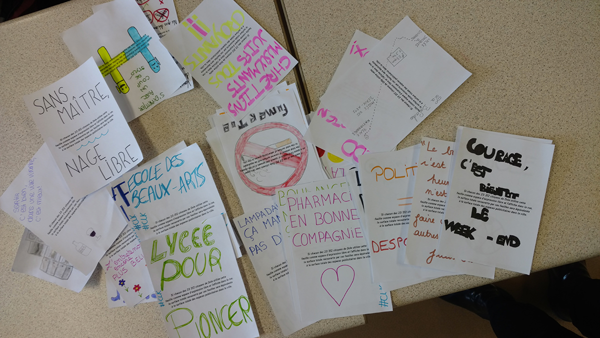 Participants are invited to express themselves on this surface using coloured felt pens and paste it in the street using adhesive tape during a collective walk in the neighborhood in order to balance the presence of advertising spaces in the city of Dole with their own opinion.